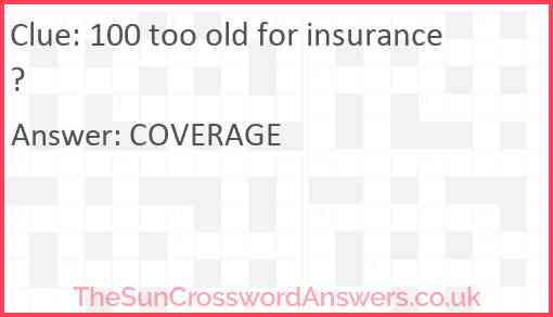 100 too old for insurance? is a crossword clue for which we have 1 possible answer and we have spotted 2 times in our database. This crossword clue was last seen on 14 February 2024 in The Sun Cryptic Crossword puzzle!