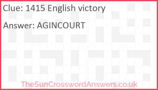 1415 English victory is a crossword clue for which we have 1 possible answer and we have spotted 1 times in our database. This crossword clue was last seen on 14 August 2021 in The Sun Coffee Time Crossword puzzle!