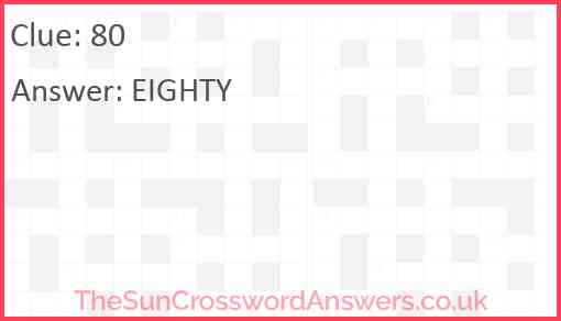 80 is a crossword clue for which we have 1 possible answer and we have spotted 1 times in our database. This crossword clue was last seen on 21 August 2023 in The Sun Coffee Time Crossword puzzle!