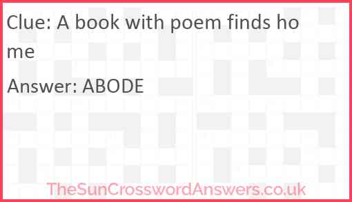 A book with poem finds home is a crossword clue for which we have 1 possible answer and we have spotted 3 times in our database. This crossword clue was last seen on 21 November 2024 in The Sun Cryptic Crossword puzzle!
