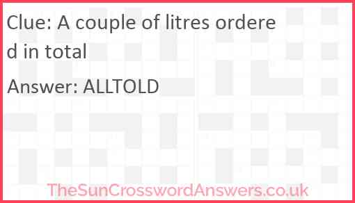 A couple of litres ordered in total is a crossword clue for which we have 1 possible answer and we have spotted 2 times in our database. This crossword clue was last seen on 28 June 2024 in The Sun Cryptic Crossword puzzle!