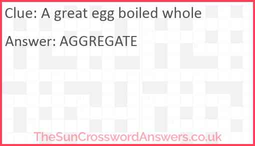 A great egg boiled whole is a crossword clue for which we have 1 possible answer and we have spotted 2 times in our database. This crossword clue was last seen on 12 July 2024 in The Sun Cryptic Crossword puzzle!