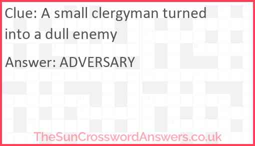 A small clergyman turned into a dull enemy is a crossword clue for which we have 1 possible answer and we have spotted 1 times in our database. This crossword clue was last seen on 24 December 2020 in The Sun Cryptic Crossword puzzle!