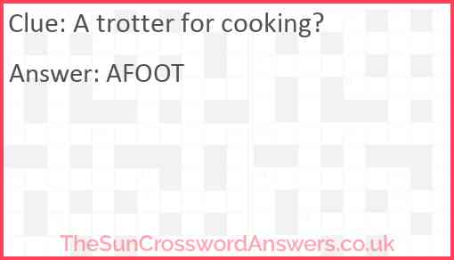 A trotter for cooking? is a crossword clue for which we have 1 possible answer and we have spotted 1 times in our database. This crossword clue was last seen on 24 February 2025 in The Sun Cryptic Crossword puzzle!