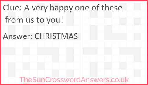 A very happy one of these from us to you! is a crossword clue for which we have 1 possible answer and we have spotted 1 times in our database. This crossword clue was last seen on 25 December 2024 in The Sun Cryptic Crossword puzzle!