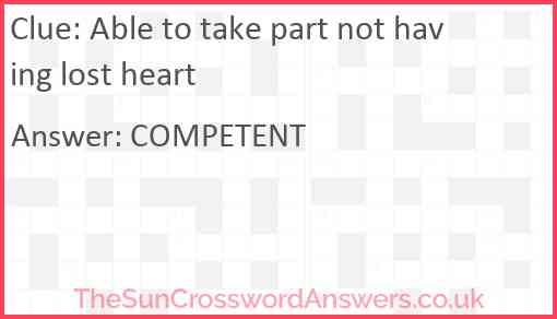 Able to take part not having lost heart is a crossword clue for which we have 1 possible answer and we have spotted 2 times in our database. This crossword clue was last seen on 05 May 2023 in The Sun Cryptic Crossword puzzle!