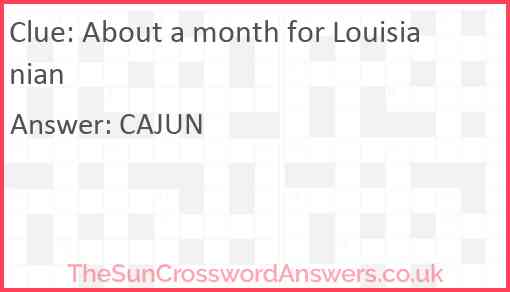About a month for Louisianian is a crossword clue for which we have 1 possible answer and we have spotted 1 times in our database. This crossword clue was last seen on 29 June 2023 in The Sun Cryptic Crossword puzzle!
