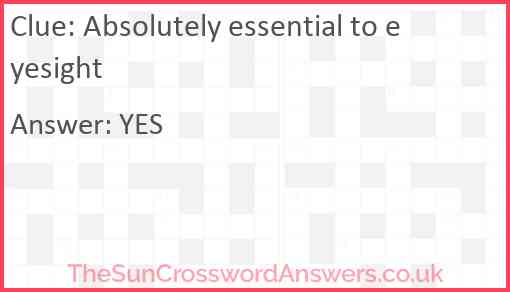 Absolutely essential to eyesight is a crossword clue for which we have 1 possible answer and we have spotted 2 times in our database. This crossword clue was last seen on 01 January 2023 in The Sun Cryptic Crossword puzzle!