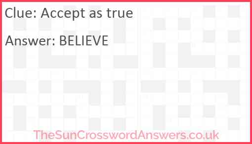 Accept as true is a crossword clue for which we have 1 possible answer and we have spotted 3 times in our database. This crossword clue was last seen on 26 March 2023 in The Sun Coffee Time Crossword puzzle!