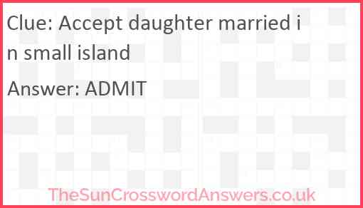 Accept daughter married in small island is a crossword clue for which we have 1 possible answer and we have spotted 3 times in our database. This crossword clue was last seen on 15 February 2024 in The Sun Cryptic Crossword puzzle!