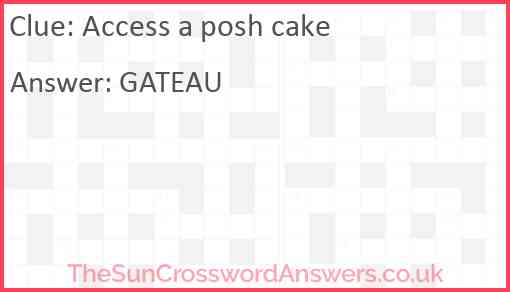 Access a posh cake is a crossword clue for which we have 1 possible answer and we have spotted 5 times in our database. This crossword clue was last seen on 14 February 2024 in The Sun Cryptic Crossword puzzle!