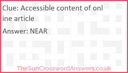 Accessible content of online article is a crossword clue for which we have 1 possible answer and we have spotted 3 times in our database. This crossword clue was last seen on 23 February 2025 in The Sun Cryptic Crossword puzzle!