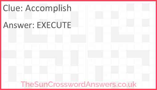 Accomplish is a crossword clue for which we have 2 possible answer and we have spotted 23 times in our database. This crossword clue was last seen on 30 May 2025 in The Sun Coffee Time Crossword puzzle!