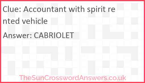 Accountant with spirit rented vehicle is a crossword clue for which we have 1 possible answer and we have spotted 2 times in our database. This crossword clue was last seen on 20 November 2022 in The Sun Cryptic Crossword puzzle!