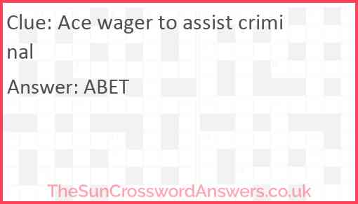 Ace wager to assist criminal is a crossword clue for which we have 1 possible answer and we have spotted 2 times in our database. This crossword clue was last seen on 23 December 2024 in The Sun Cryptic Crossword puzzle!