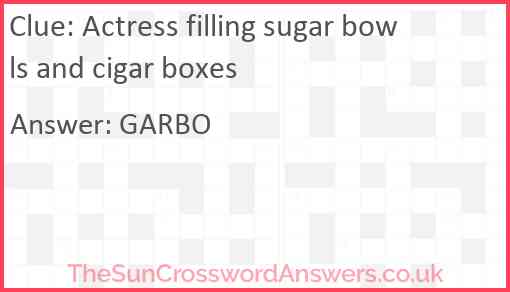 Actress filling sugar bowls and cigar boxes is a crossword clue for which we have 1 possible answer and we have spotted 1 times in our database. This crossword clue was last seen on 02 August 2022 in The Sun Cryptic Crossword puzzle!
