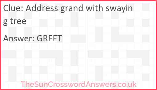 Address grand with swaying tree is a crossword clue for which we have 1 possible answer and we have spotted 4 times in our database. This crossword clue was last seen on 18 August 2022 in The Sun Cryptic Crossword puzzle!