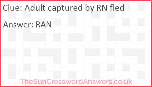 Adult captured by RN fled is a crossword clue for which we have 1 possible answer and we have spotted 3 times in our database. This crossword clue was last seen on 28 May 2023 in The Sun Cryptic Crossword puzzle!