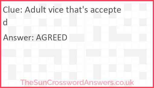 Adult vice that's accepted is a crossword clue for which we have 1 possible answer and we have spotted 2 times in our database. This crossword clue was last seen on 07 June 2023 in The Sun Cryptic Crossword puzzle!