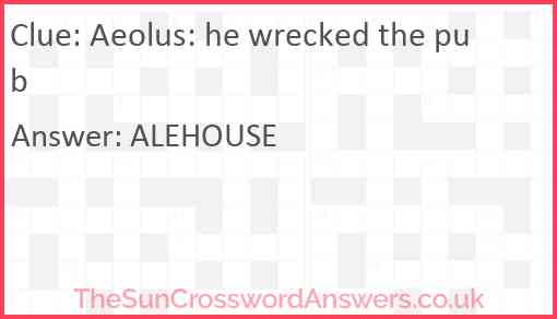 Aeolus: he wrecked the pub is a crossword clue for which we have 1 possible answer and we have spotted 1 times in our database. This crossword clue was last seen on 24 February 2025 in The Sun Cryptic Crossword puzzle!