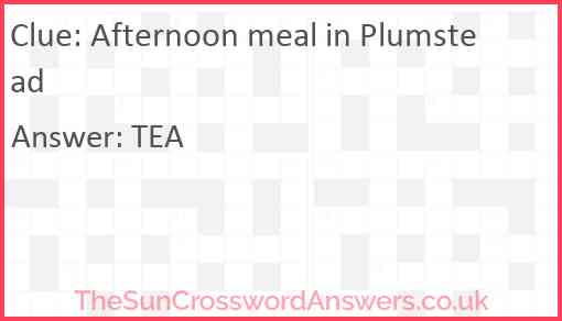 Afternoon meal in Plumstead is a crossword clue for which we have 1 possible answer and we have spotted 1 times in our database. This crossword clue was last seen on 17 December 2020 in The Sun Cryptic Crossword puzzle!