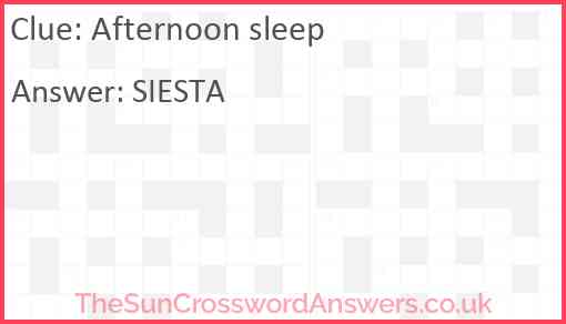 Afternoon sleep is a crossword clue for which we have 1 possible answer and we have spotted 2 times in our database. This crossword clue was last seen on 28 May 2023 in The Sun Coffee Time Crossword puzzle!