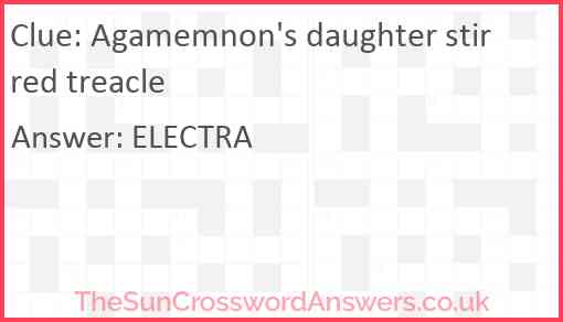 Agamemnon's daughter stirred treacle is a crossword clue for which we have 1 possible answer and we have spotted 1 times in our database. This crossword clue was last seen on 26 January 2023 in The Sun Cryptic Crossword puzzle!