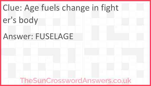 Age fuels change in fighter's body? is a crossword clue for which we have 1 possible answer and we have spotted 4 times in our database. This crossword clue was last seen on 22 February 2025 in The Sun Cryptic Crossword puzzle!