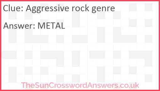 Aggressive rock genre is a crossword clue for which we have 1 possible answer and we have spotted 2 times in our database. This crossword clue was last seen on 19 May 2020 in The Sun Coffee Time Crossword puzzle!