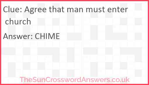 Agree that man must enter church is a crossword clue for which we have 1 possible answer and we have spotted 3 times in our database. This crossword clue was last seen on 03 January 2024 in The Sun Cryptic Crossword puzzle!