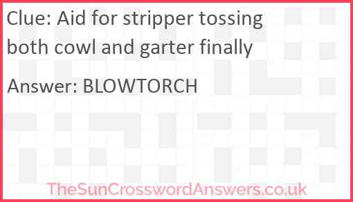 Aid for stripper tossing both cowl and garter finally is a crossword clue for which we have 1 possible answer and we have spotted 1 times in our database. This crossword clue was last seen on 03 December 2021 in The Sun Cryptic Crossword puzzle!