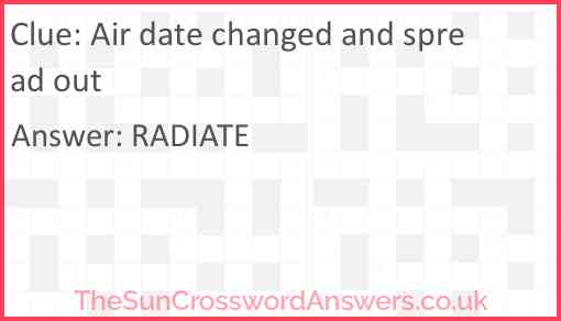 Air date changed and spread out is a crossword clue for which we have 1 possible answer and we have spotted 3 times in our database. This crossword clue was last seen on 17 April 2022 in The Sun Cryptic Crossword puzzle!