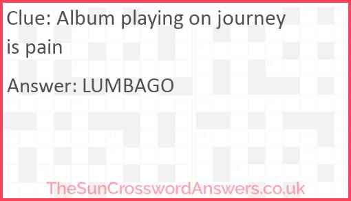 Album playing on journey is pain is a crossword clue for which we have 1 possible answer and we have spotted 2 times in our database. This crossword clue was last seen on 16 December 2023 in The Sun Cryptic Crossword puzzle!