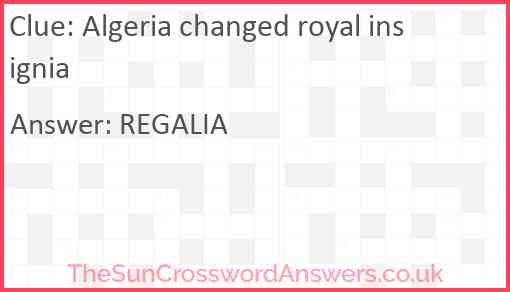 Algeria changed royal insignia is a crossword clue for which we have 1 possible answer and we have spotted 3 times in our database. This crossword clue was last seen on 02 May 2024 in The Sun Cryptic Crossword puzzle!