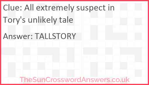 All extremely suspect in Tory's unlikely tale is a crossword clue for which we have 1 possible answer and we have spotted 1 times in our database. This crossword clue was last seen on 11 September 2022 in The Sun Cryptic Crossword puzzle!
