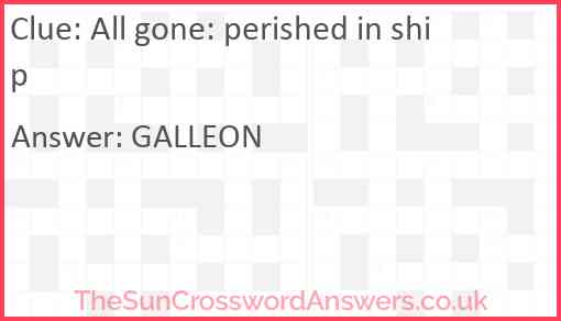 All gone: perished in ship is a crossword clue for which we have 1 possible answer and we have spotted 2 times in our database. This crossword clue was last seen on 26 January 2023 in The Sun Cryptic Crossword puzzle!