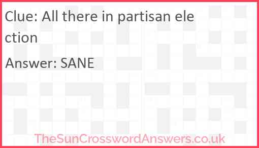 All there in partisan election is a crossword clue for which we have 1 possible answer and we have spotted 1 times in our database. This crossword clue was last seen on 13 October 2021 in The Sun Cryptic Crossword puzzle!