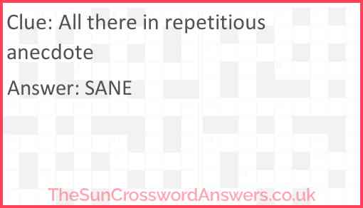 All there in repetitious anecdote is a crossword clue for which we have 1 possible answer and we have spotted 2 times in our database. This crossword clue was last seen on 08 April 2022 in The Sun Cryptic Crossword puzzle!
