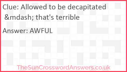 Allowed to be decapitated — that's terrible is a crossword clue for which we have 1 possible answer and we have spotted 1 times in our database. This crossword clue was last seen on 25 February 2019 in The Sun Cryptic Crossword puzzle!