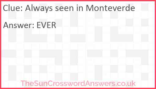 Always seen in Monteverde is a crossword clue for which we have 1 possible answer and we have spotted 3 times in our database. This crossword clue was last seen on 17 April 2024 in The Sun Cryptic Crossword puzzle!