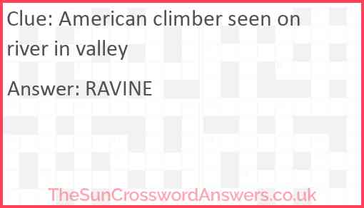 American climber seen on river in valley is a crossword clue for which we have 1 possible answer and we have spotted 1 times in our database. This crossword clue was last seen on 02 November 2024 in The Sun Cryptic Crossword puzzle!