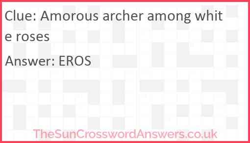 Amorous archer among white roses is a crossword clue for which we have 1 possible answer and we have spotted 3 times in our database. This crossword clue was last seen on 12 December 2023 in The Sun Cryptic Crossword puzzle!