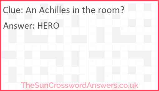 An Achilles in the room? is a crossword clue for which we have 1 possible answer and we have spotted 2 times in our database. This crossword clue was last seen on 01 September 2023 in The Sun Cryptic Crossword puzzle!