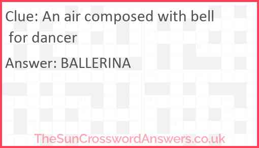An air composed with bell for dancer is a crossword clue for which we have 1 possible answer and we have spotted 2 times in our database. This crossword clue was last seen on 19 February 2021 in The Sun Cryptic Crossword puzzle!