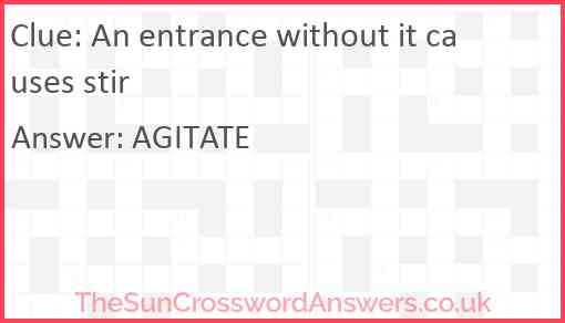 An entrance without it causes stir is a crossword clue for which we have 1 possible answer and we have spotted 6 times in our database. This crossword clue was last seen on 05 August 2024 in The Sun Cryptic Crossword puzzle!