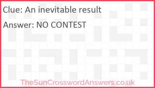 An inevitable result is a crossword clue for which we have 1 possible answer and we have spotted 1 times in our database. This crossword clue was last seen on 23 March 2019 in The Sun Coffee Time Crossword puzzle!