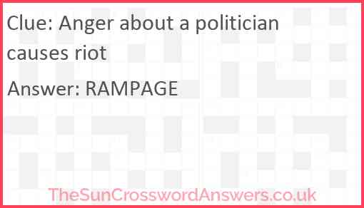 Anger about a politician causes riot is a crossword clue for which we have 1 possible answer and we have spotted 4 times in our database. This crossword clue was last seen on 04 July 2022 in The Sun Cryptic Crossword puzzle!