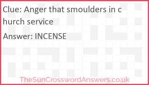 Anger that smoulders in church service is a crossword clue for which we have 1 possible answer and we have spotted 3 times in our database. This crossword clue was last seen on 14 March 2024 in The Sun Cryptic Crossword puzzle!