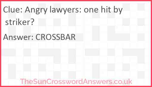 Angry lawyers: one hit by striker? is a crossword clue for which we have 1 possible answer and we have spotted 1 times in our database. This crossword clue was last seen on 21 June 2024 in The Sun Cryptic Crossword puzzle!
