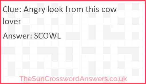 Angry look from this cow lover is a crossword clue for which we have 1 possible answer and we have spotted 1 times in our database. This crossword clue was last seen on 20 February 2025 in The Sun Cryptic Crossword puzzle!